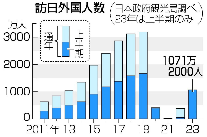 2023年7月19日,日本观光局发表相关数据(2023.4-6月):2023年4月-6月,访日外国游客的消费金额达到1兆2052亿日元,是2019年的95.1%。