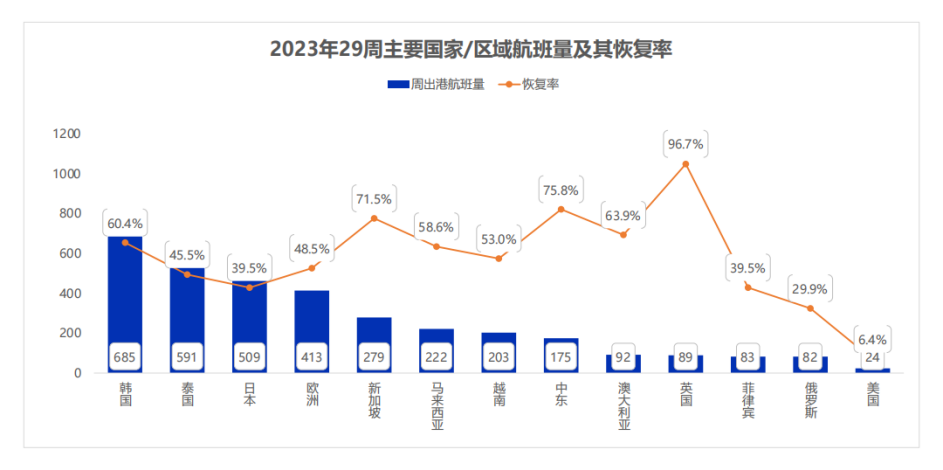 2、从航班架次趋势来看,跨境航班架次恢复率由1月份10%上升至6月份42%,二季度整体恢复率(38%)超过一季度(16%)一倍以上。2023年第29周中国-韩国航班量居于首位,中韩航班恢复率超过六成,中日航班恢复率将近四成,中美航班恢复率为6.4%。