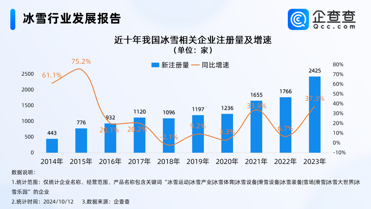 企查查数据显示,2017年至2020年期间,我国冰雪相关企业每年注册量保持在1000家至1300家之间,2021年开始,我国冰雪相关企业每年注册量开始波动式增加,其中2021年全年注册量同比增加33.9%至1655家,2023年,我国冰雪相关企业每年注册量首次突破2000家,全年注册量同比增加37.3%至2425家,达近五年注册量及增速双高峰。