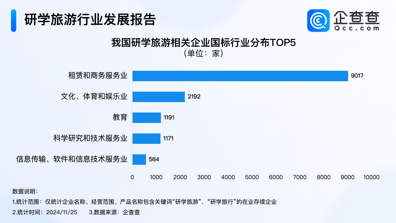 企查查数据显示,伴随2023年全国经济快速复苏,全年研学旅游相关企业注册量快速回升88.9%至1043家,截至11月25日,2024年我国已注册812家研学旅游相关企业。企业存量方面,我国现存1.7万家研学旅游相关企业,行业分布上,归属租赁和商务服务业的企业最多,占比58.4%;注册资本区间分布上,我国研学旅游相关企业在注册资本500万元以内的,占比超七成。