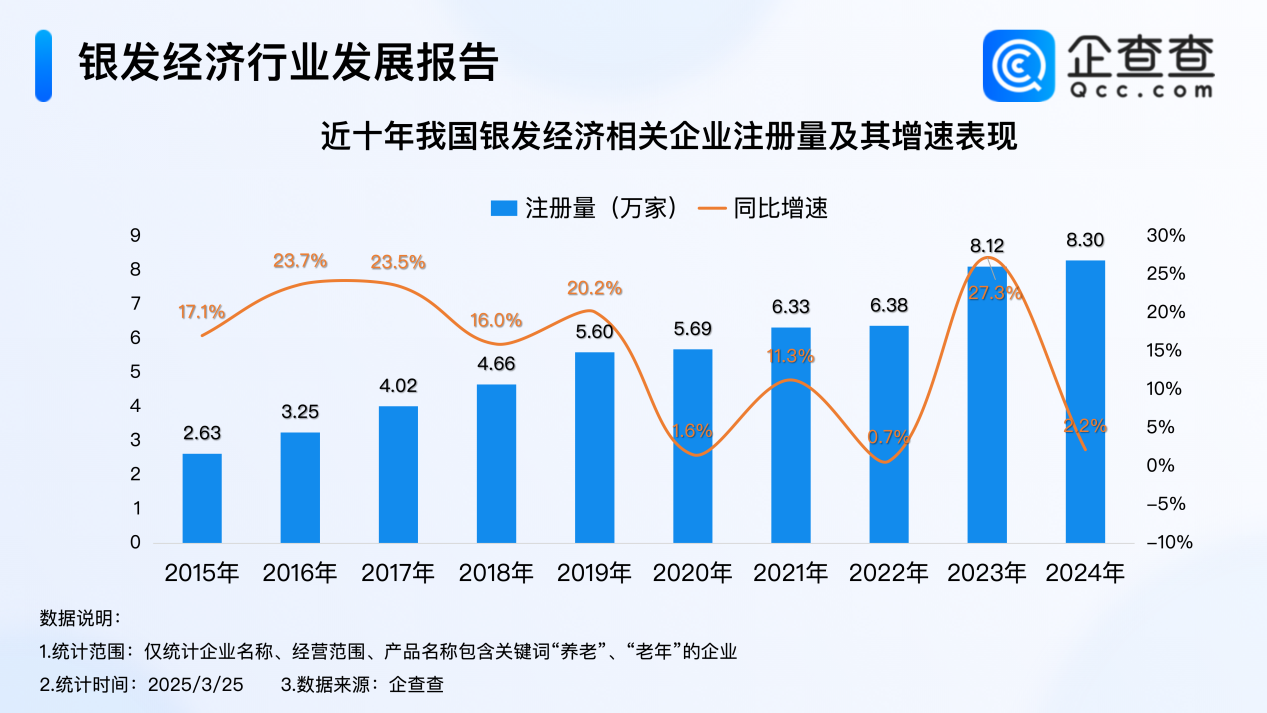 企查查数据显示,近十年,我国银发经济相关企业注册量逐年增加,其中2023年注册量同比增加27.3%至8.12万家,达近十年相关企业注册量增速峰值,2024年全年注册8.30万家银发经济相关企业,同比增加2.2%,创近十年相关企业注册量新高。截至3月25日,2025年我国已注册1.76万家银发经济相关企业。