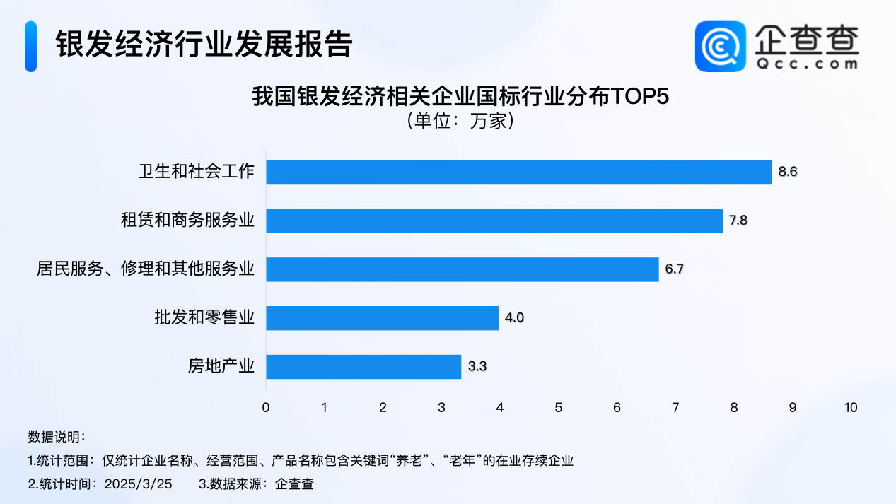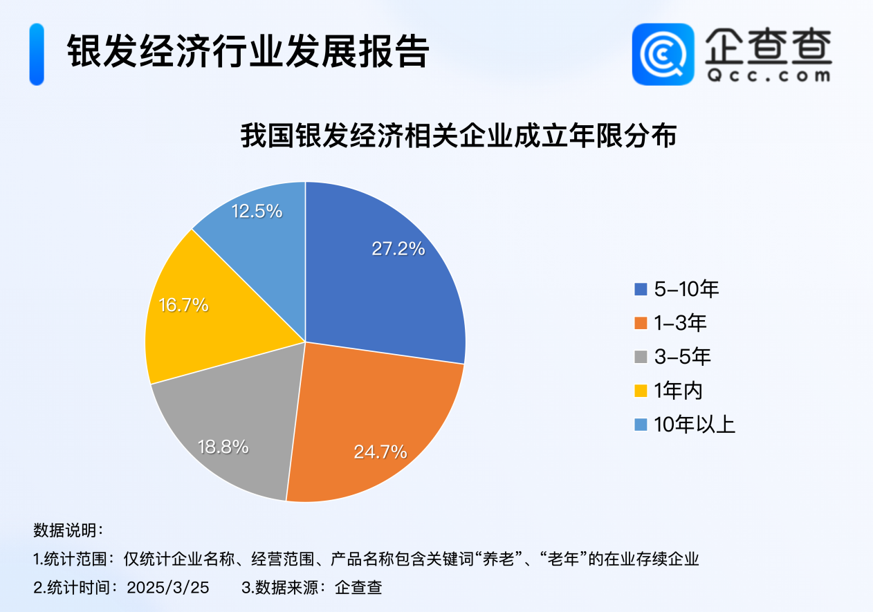 企查查数据显示,近十年,我国银发经济相关企业注册量逐年增加,2024年我国累计注册8.3万家银发经济相关企业,创近十年注册量新高;截至3月25日,2025年我国已注册超1.7万家银发经济相关企业。企业存量方面,我国现存51万家银发经济相关企业,其中成立5至10年之间的企业最多,占比超27%,行业分布上,卫生和社会工作行业占比超两成。
