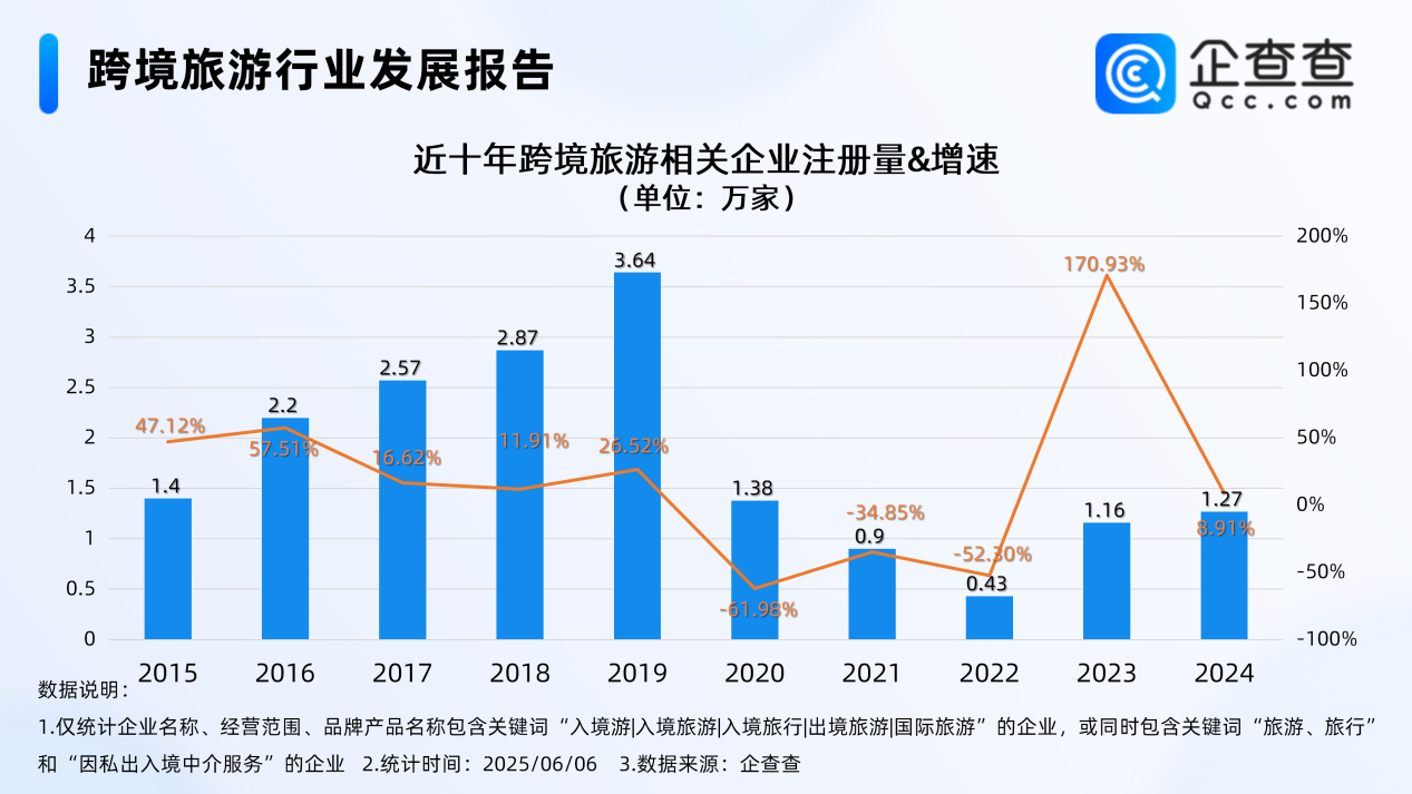 企查查数据显示,国内现存跨境旅游相关企业11.62万家。2023年全年注册跨境旅游相关企业1.16万家,同比增长170.93%,创近十年注册增速峰值。2024年全年注册1.27万家相关企业,同比增长8.91%。