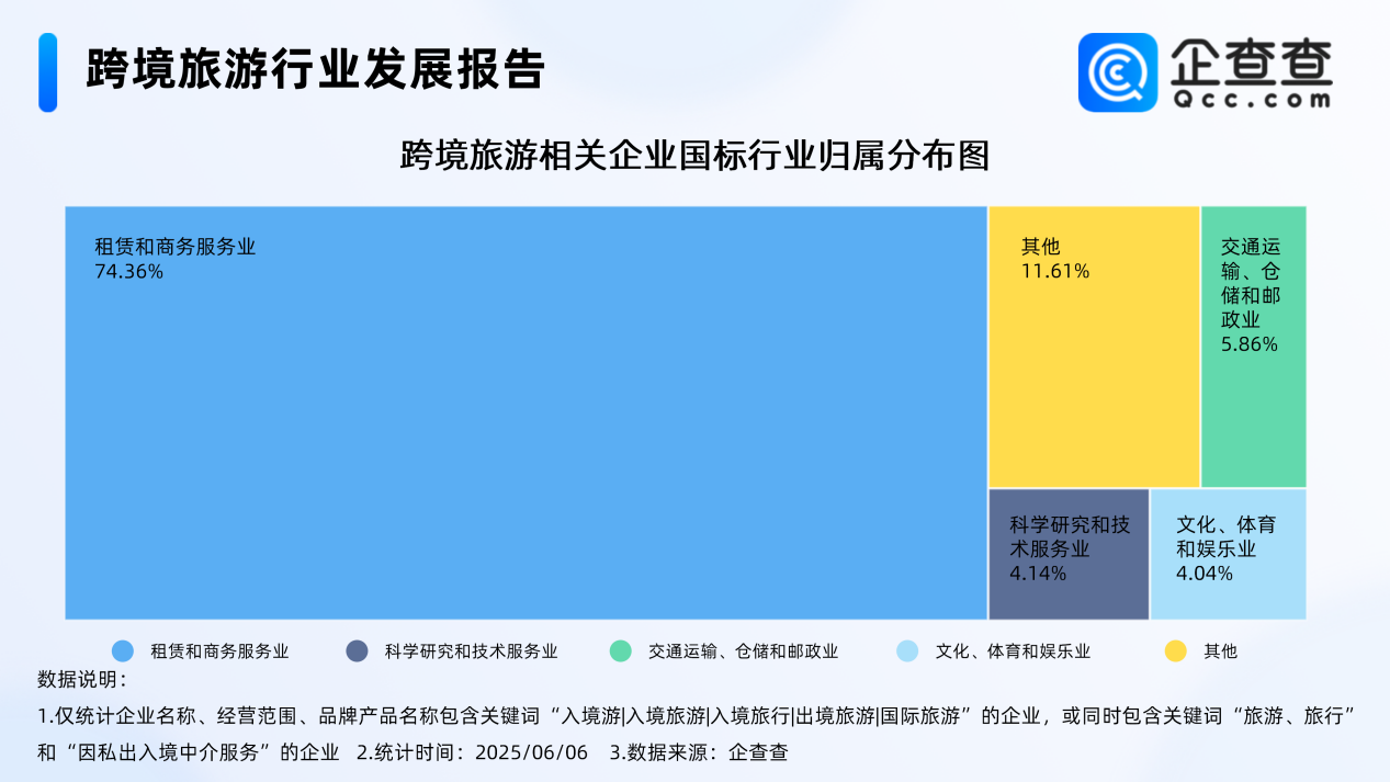 企查查数据显示,从国标行业来看,跨境旅游相关企业主要归属于租赁和商务服务业,占比超七成,达74.36%。其次,归属于交通运输、仓储和邮政业及科学研究和技术服务业的相关企业分别占比5.86%、4.14%。