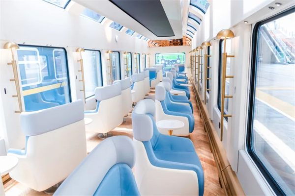 在列车体验方面,将御膳技艺与河北物产完美融合,推出四季轮转的时令美馔;车厢内非遗大师现场展示皮影上色、桃木雕刻等传统非遗,"移动沉浸式剧场"让旅客化身历史角色参与互动;全景车窗配合智能调光技术,将美好风景尽收眼底;娱乐车厢轮番上演京剧、相声等精彩演出,配合淡雅茶香与咖啡香气,为旅客带来好吃、好玩、好看、好听、好闻一体的立体文化体验空间,让燕赵大地的文化瑰宝在旅途中焕发新生。