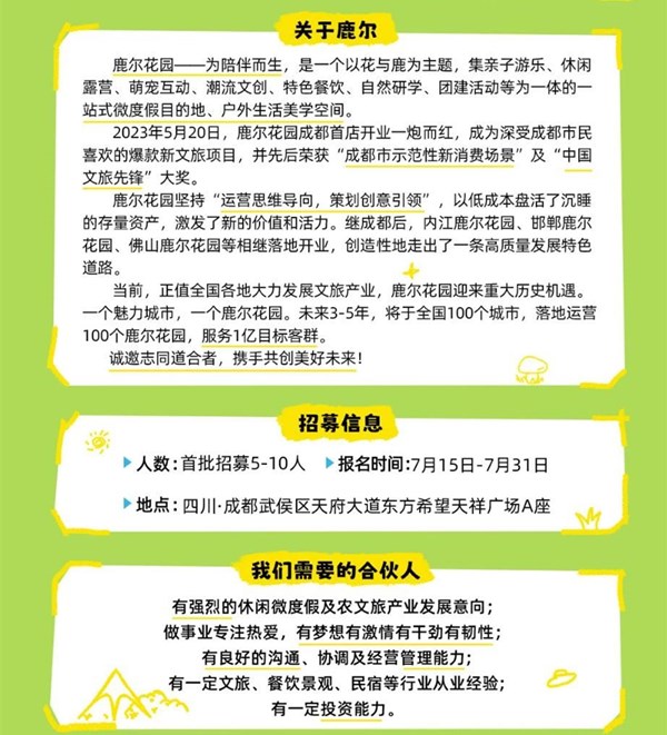 当前,正值全国各地大力发展文旅产业,鹿尔花园迎来重大历史机遇。一个魅力城市,一个鹿尔花园。未来3-5年,将于全国100个城市,落地运营100个鹿尔花园,服务1亿目标客群。
