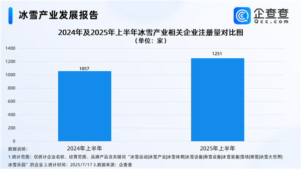 企查查数据显示,从注册量角度来看,近十年冰雪产业相关企业注册量整体呈上升趋势,2023年注册量首次突破2000家,达2484家,2024年注册量达2382家。截至目前,今年已注册1364家,其中上半年注册量达1251家,同比增长18.35%。