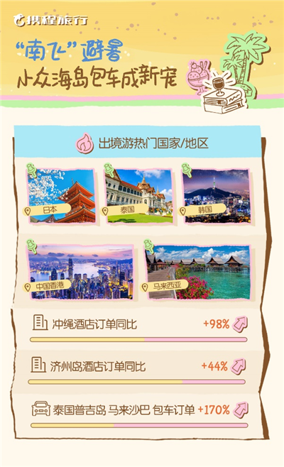 和国内避暑游大热趋同,出境游表现亮眼的目的地同样具有清凉属性,日本、泰国、韩国、中国香港、马来西亚位列前五出境游热门目的地。其中,短线海岛游增长强劲,日本冲绳酒店订单同比去年增长98%,韩国济州岛酒店订单同比增长44%。包车去海岛度假也成为了暑期不少游客的共同选择,泰国普吉岛、马来沙巴等地订单量同比增长170%以上。此外,海外长线包车游心智持续攀升,澳大利亚、意大利、德国等地订单增势明显。