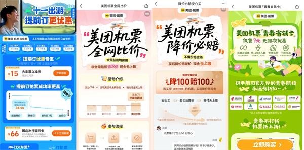 ▲美团旅行上线“十一出游提前订”“青春省钱卡”“全网比价”“降价必赔”等活动和权益