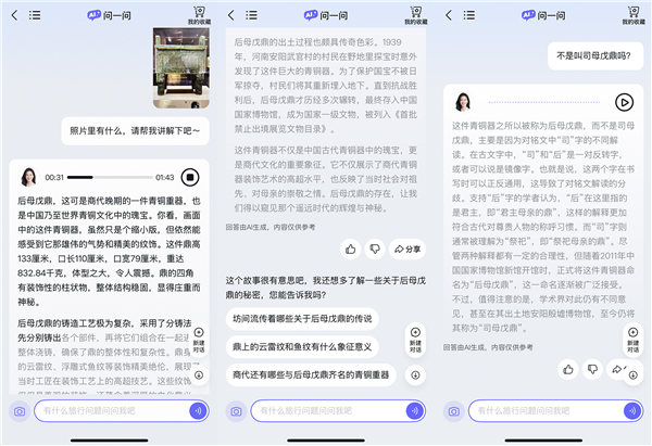 举个例子,打开飞猪AI“问一问”,拍摄后母戊鼎的图像,AI思考之后,旋即开始讲解:它先详尽介绍了后母戊鼎的年代、体型、纹饰等,再扩展到后母戊鼎使用的铸造法,以及不同符号背后所代表的文化意义;接着,它“回忆”了1939年后母戊鼎出土时,河南安阳武官村的村民为保护国宝不被日寇掠走而藏埋于后院地下的故事。首轮讲解完,AI会继续与用户交流,鼓励用户继续对话或提问,如“坊间流传着哪些关于后母戊鼎的传奇故事”“鼎上的饕餮纹藏着怎样的祭祀寓意”等。