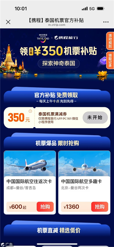 “神奇泰国”专项旅游补贴计划主要覆盖机票、酒店两大品类,中国游客在携程平台预订由中国大陆前往泰国的机票,有机会享受“梯度满减”补贴,即不含税票价满51元减50元、满501元减100元、满1501元减250元、满2501元减350元,该项补贴适用于所有中国大陆至泰国的航线,不限单程或往返、直飞或中转。同时,携程还联合多家航司提供限时低价,叠加赴泰机票优惠。