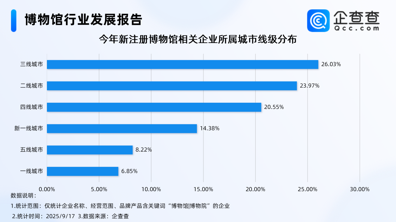 企查查数据显示,注册量方面,2021年-2024年相关企业每年注册量维持在250家-600家之间,2024年注册量达291家,截至目前今年已注册148家,今年新注册的博物馆相关企业多分布在三线、二线城市,分别占比26.03%、23.97%。