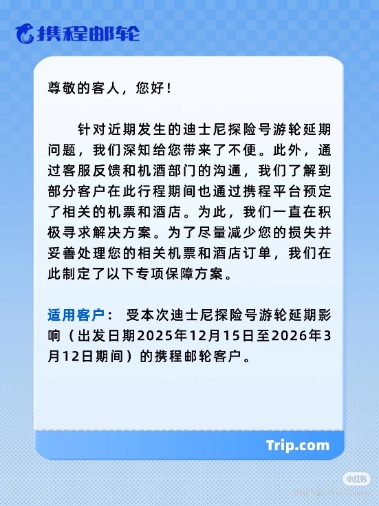近日,受迪士尼探险号游轮部分航次延期运营影响,部分游客行程面临调整。携程邮轮于9月16日率先推出专项保障方案,宣布对符合条件的新加坡往返机票及当地酒店订单提供免费改期或全额退订服务,相应损失均由平台承担,获得广泛认可。