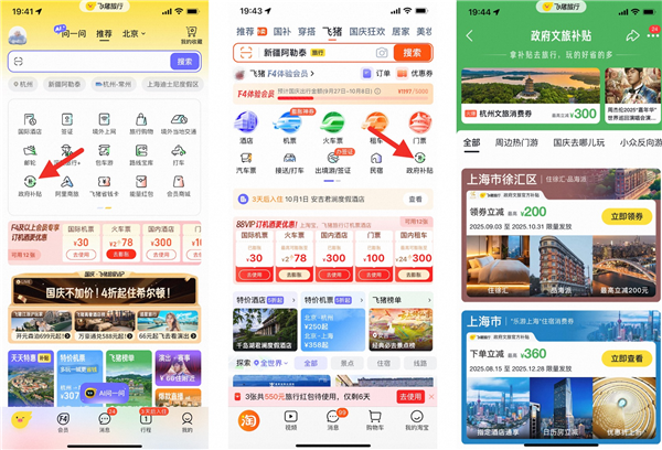 在今年中秋国庆黄金周期间,飞猪发放的文旅消费补贴包含广东省21个地级市、四川省18个地级市和3个自治州,以及上海、海口、杭州、宁波、日喀则等50余个目的地,覆盖酒店、门票、机票、跟团游等多类场景,最高单笔立减600元。从飞猪《2025中秋国庆假期出游风向标》显示的预订情况看,今年中秋国庆假期的多目的地“串游”趋势更明显。新的“政府消费券”频道正当其时,一个长假玩转多个城市的消费者可以一次性获取多地补贴,体验更加顺畅简单。
