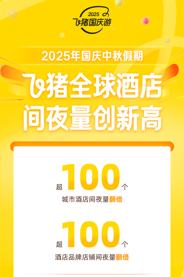 增势带动一批酒店商家在飞猪平台收获生意新增量。飞猪数据显示,超100个酒店品牌店铺间夜量至少翻了1倍。锦江、华住、首旅如家、万豪、尚美、希尔顿、亚朵、东呈、格林、程艺、德胧、万达酒店及度假村、慧友、凯悦、君澜等酒店品牌的官方旗舰店在“十一”黄金周综合预订情况突出,位居前列。