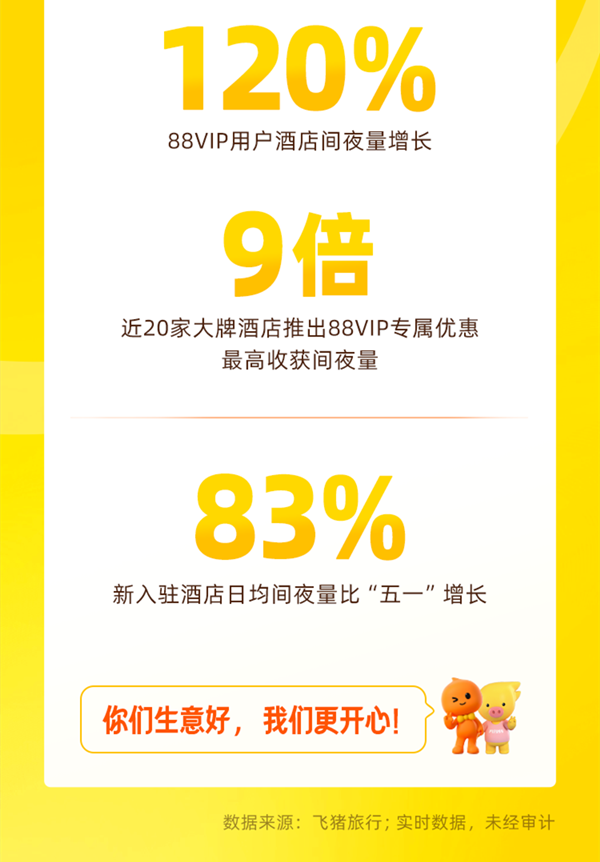 以88VIP为例,10月1日至10月8日期间,88VIP用户为酒店带来的间夜量增长了120%,且人均消费保持上扬态势。与此同时,今年“十一”,近20家大牌酒店与飞猪深度合作,为88VIP提供专属优惠及多种出游权益,让会员无需比价,放心下单。截至10月8日,这些酒店来自88VIP用户的间夜量同比去年全部翻倍,最高增长可达9倍。