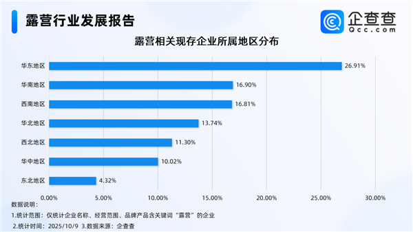 企查查数据显示,截至10月9日,国内露营相关企业现存量达25.66万家,主要分布在华东地区、华南地区、西南地区等地,其中位于华东地区的相关企业最多,占比达26.91%,其次为华南地区、西南地区,分别占比16.9%、16.81%。