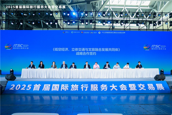 旅服会期间,多个创新领域取得实质性突破。中国旅行社协会铁道旅游分会、定制旅行分会与中国国土经济学会国土交通委员会达成三方合作,将共同开发“高铁+目的地”“专列+主题体验”等特色产品。《低空经济、立体交通与文旅融合发展共同体》战略合作协议的成功签署,将整合低空飞行运营、文旅项目开发等资源,打造低空观光、航空运动等多元场景,填补区域低空文旅业态空白。