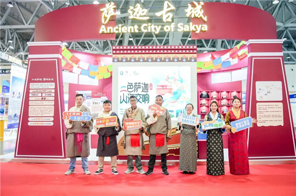 西藏萨迦县以“三色萨迦·山海交响”为主题惊艳亮相,展馆以“雪域文脉·萨迦印记”为设计内核,通过唐卡、皮具、银器等非遗展品,让参观者近距离感受雪域高原的文化魅力。身着藏式特色服饰的工作人员为参观者献上哈达,详细讲解萨迦文旅资源,成为展会中一道亮丽的风景线。