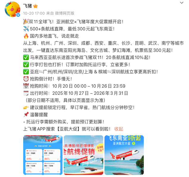 据了解,作为亚洲最大的低成本航空公司,今年亚洲航空携超低折扣参与飞猪双11。10月20日至10月26日期间,亚洲航空和飞猪推出泰国、马来西亚、印度尼西亚、菲律宾等多国全航线促销活动,跨境航段价格最低300元起(含税)、境内航段最低100元起(含税)。