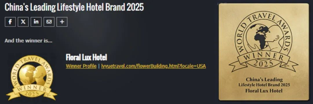 值得一提的是,过去两年“中国领先生活酒店品牌”奖项均由文华东方酒店集团获得,花筑奢首次参评即荣膺此奖,充分展现了旅悦集团在全球酒店行业的卓越实力,也彰显了花筑奢在高端酒店领域的独特优势,也将品牌愿景——让世界看到中国民宿之美——推向新高度。