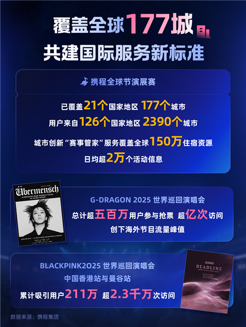 节演展赛与旅游的深度融合,考验的不仅是票务能力,更是全球资源整合、目的地协同与全链路服务体验的生态构建能力。今年,携程携手全球大型现场娱乐公司Live Nation亚洲与信息科技整合解决方案企业Cityline达成战略合作,重新定义“旅行+演出”的服务标准。携程通过整合周边景点门票的产品策略,形成完整文化体验链。与Live Nation合作的BLACKPINK世界巡回演唱会香港站与曼谷站累计吸引用户211万,超2.3千万次访问。
