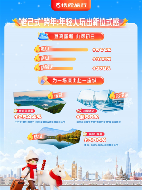 “为一场演出赴一座城”的现象在元旦期间尤为突出。如哈尔滨因“如歌的旅程”跨年演唱会带动机票预订增长82%,酒店预订提升81%。诸暨因王力宏演唱会及西施跨年音乐节旅游订单增长2544%,南宁因华晨宇演唱会旅游订单增长214%,佛山因“2025-2026 葫芦果音乐节”订单增长306%,沈阳工业摇滚音乐节带动元旦当日旅游订单增长翻倍。演出活动已成为拉动地方旅游增长的重要引擎。