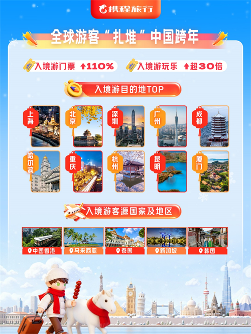 元旦假期,入境游市场保持强劲增长,门票预订量同比增110%,入境体验型玩乐产品预订量增长超30倍。热门目的地包括上海、北京、深圳、广州、成都、哈尔滨、重庆、杭州、昆明、厦门,主要客源国家及地区为中国香港、马来西亚、泰国、新加坡、韩国等地。