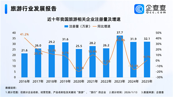 企查查数据显示,2023年-2025年,旅游相关企业每年注册量均超30万家,2023年全年,我国旅游相关企业注册量同比大幅增加43.9%至37.7万家,成为近五年注册量及其增速最大的一年;2025年全年,我国累计注册32.1万家旅游相关企业,与2024年同期基本持平。