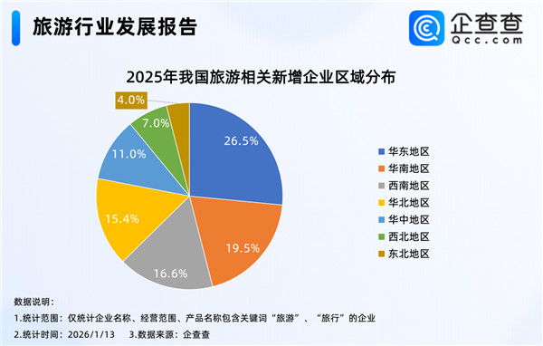 企查查数据显示,2025年以来新注册的32万余家旅游相关企业中,位于华东地区的相关企业最多,占比26.5%,其次是华南地区,占比19.5%,东北地区相对最少,占比4.0%。