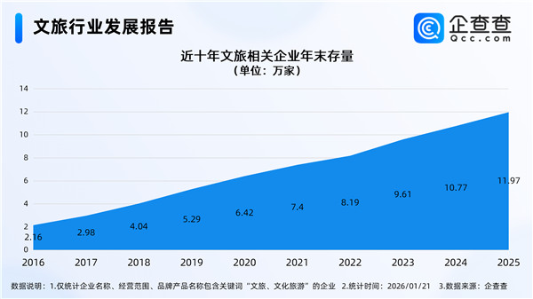 企查查数据显示,截至1月21日,国内现存文旅相关企业12.51万家。近十年文旅相关企业存量规模持续增长,2025年末存量达11.97万家,较十年前(2016年)增长了近5倍。从注册资本分布来看,文旅相关现存企业多为轻量级企业,注册资本在200万元以内的相关企业占比近半数。从地区分布来看,分布在华东地区的文旅相关企业最多,占比29.62%。注册量方面,2023年-2025年每年注册量均在2万家以上,其中2025年注册量达2.05万家。