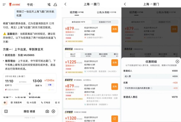 例如,当用户对千问APP说,“帮我订2月12日上海飞厦门的东航机票。”千问即刻推荐了符合用户要求的MU5665、MU5639、MU5647三个航班,并在商品卡片上标注“千问专享价”,点击预订均可享受几十元不等的专属优惠。