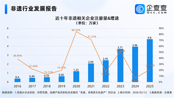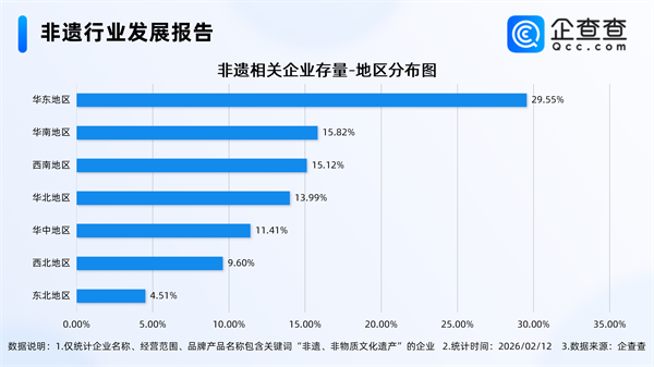 企查查数据显示,截至2月12日,国内现存非遗相关企业18.54万家。近十年非遗相关企业注册量呈持续增长态势,2025年全年注册4.8万家非遗相关企业,同比增长21.10%,创近十年注册量新高。截至目前,今年已注册非遗相关企业0.51万家。存量方面,从经营时间来看,非遗相关企业多成立于近三年,成立年限在1-3年的相关企业最多,占比34.99%。从地区分布来看,非遗相关企业多分布在华东地区,占比达29.55%。