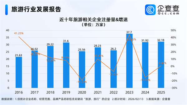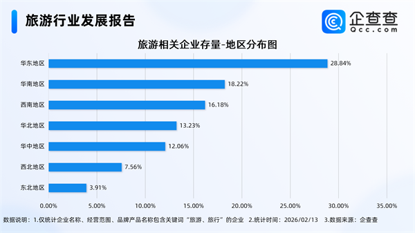企查查数据显示,截至2月13日,国内现存旅游相关企业235.98万家。近十年相关企业注册量呈整体增长态势,2025年全年注册32.18万家相关企业,截至目前,今年已注册旅游相关企业3.03万家。存量方面,从经营时间来看,成立年限在5-10年的旅游相关企业最多,占比31.16%。从地区分布来看,分布在华东地区的旅游相关企业最多,占比28.84%。