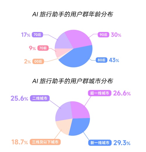 用户画像数据进一步凸显AI的普适性。80后与90后构成核心用户群,占比达73%,70后及更年长用户占比26%,打破AI“年轻人专属”的刻板印象;新一线及以下城市用户合计占比近七成,说明AI在信息获取成本较高的区域更具价值。场景方面,独行游客占比42%,家庭游占比27%,无论是独自出行的决策需求,还是家庭游的复杂规划,AI均成为重要辅助。