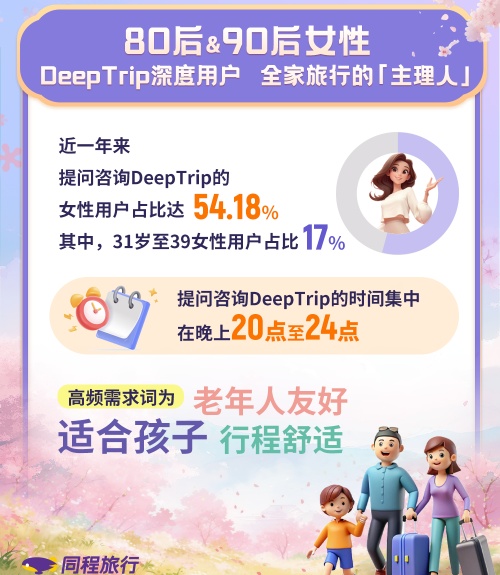 近一年来,平台上73%的亲子游订单和59%的携父母出行订单都来自80后和90后女性。面对多代际的复杂需求,她们十分懂得高效“借力”,并成为同程旅行AI智能体DeepTrip的资深玩家。