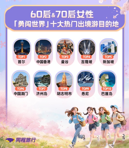 她们最爱在3月、4月、9月、11月出行,完美避开寒暑假和黄金周。淡季的高性价比也给了她们松弛出发、从容探索的底气。同程旅行数据显示,60和70后女性预订商务舱机票的比例较其他女性用户高出16个百分点,预订高品质酒店的比例较其他女性用户高出13个百分点。她们最青睐的出境游目的地前10名依次是首尔、中国香港、曼谷、吉隆坡、新加坡、中国澳门、济州岛、胡志明市、悉尼、巴厘岛。