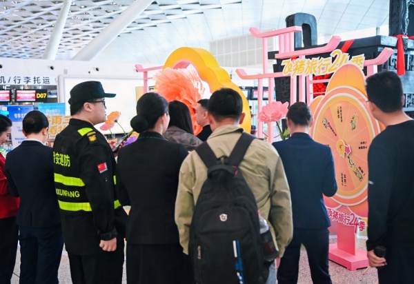 (图:旅客在郑州机场“旅行24季·谷雨”活动现场驻足打卡)
