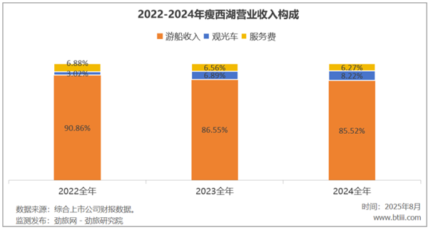 2024年,瘦西湖主营业务中,游船业务、观光车业务、服务费分别占营业收入85.52%、8.22%、6.27%。