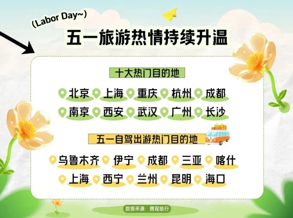 五一假期,最热门的旅游目的地依次为北京、上海、杭州、成都、重庆、广州、南京、武汉、西安、深圳。