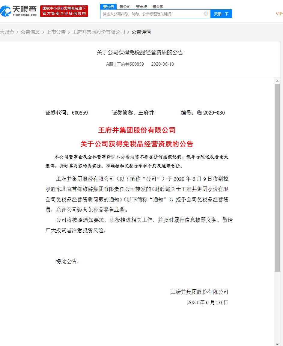 6月9日晚,王府井集团股份有限公司发布公告称,公司收到控股股东北京首都旅游集团有限责任公司转发的《财政部关于王府井集团股份有限公司免税品经营资质问题的通告》,公司获得免税品经营资质,允许公司经营免税品零售业务。