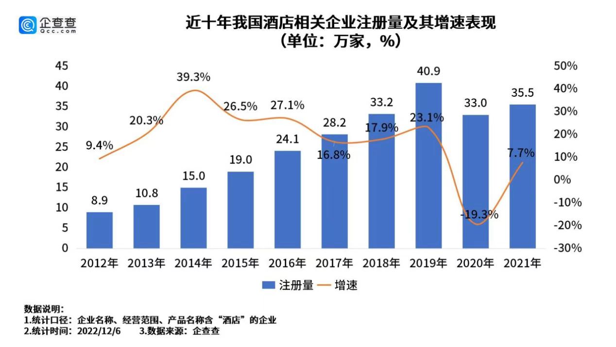 企查查数据显示,我国现存酒店相关企业226.9万家。2022年上半年,我国新增酒店相关企业14.7万家,同比减少14.0%。2012年至2019年期间,我国酒店相关企业注册量逐年增加,其中2014年注册量同比增加39.3%至15.0万家,成为近十年注册量增速最大的一年,2019年,全国新增40.9万家酒店相关企业,同比增加23.1%,成为近十年注册量最大的一年;2020年,受疫情冲击,酒店相关企业注册量同比减少19.3%至33.0万家,次年伴随疫情防控效果显现,酒店相关企业注册量同比上浮7.7%至35.5万家。至12月6日,2022年新增28.0万家酒店相关企业。