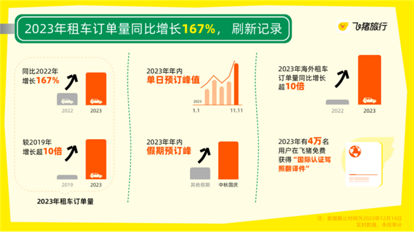 飞猪于2021年推出“安心租”标准,包含免费取消、车辆及违章押金双免等7项服务内容,2023年在部分城市又升级推出“飞猪心选”服务,消费者下单相应标识的车辆无需承担理赔范围内的全部车辆损失(含玻璃和轮胎)、停运费、折旧费等。《报告》显示,2023年“安心租”“飞猪心选”订单量同比2022年增长近2倍。