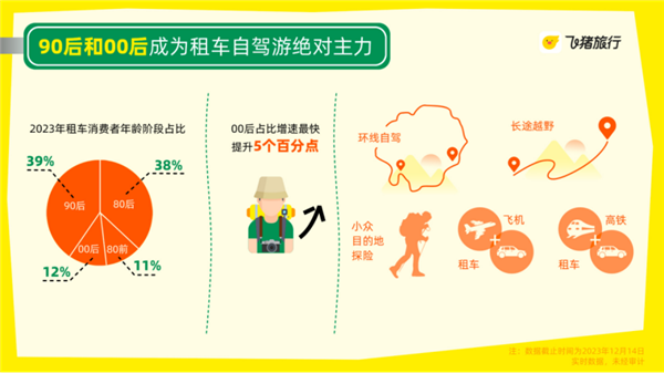 2023年,国内租车市场消费人群结构进一步年轻化。《报告》显示,2023年,90后订单占比从去年的35%提升至39%,是租车自驾游主力军。00后占比增速最快,年内提升超5个百分点。90后和00后累计已占据租车消费群体的半壁江山。