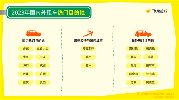 数据还显示,成都、乌鲁木齐、北京、三亚、海口、贵阳、杭州、大理、广州、重庆等是2023年租车热门目的地,乌鲁木齐、郑州、福州等目的地增速较快。