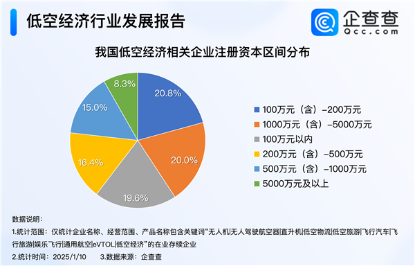 企查查数据显示,2024年我国低空经济相关企业注册量同比增加14.3%至1.05万家。企业存量方面,我国现存7.6万家低空经济相关企业,行业分布上,归属科学研究和技术服务业的企业最多,占比28.5%,归属交通运输、仓储和邮政业的企业占比11.7%;注册资本区间分布上,我国低空经济相关企业注册资本超千万的企业占比近三成。