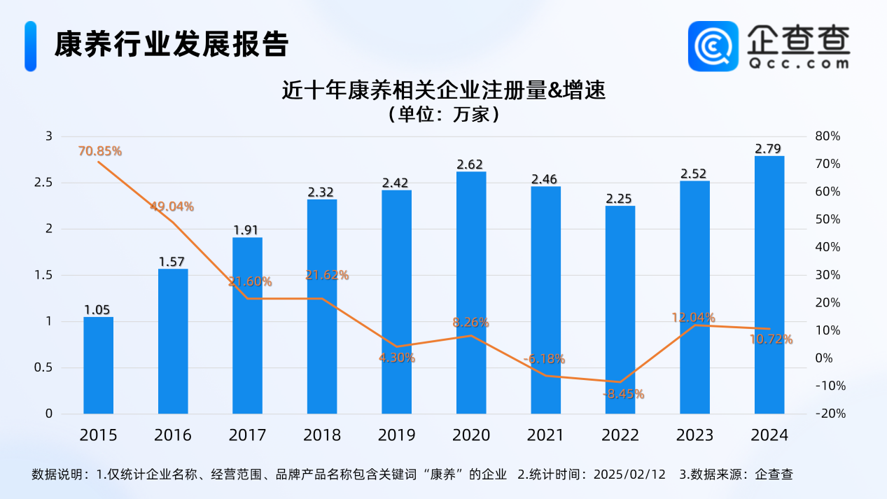 企查查数据显示,国内现存康养相关企业15.01万家。近十年相关企业注册量呈整体增长态势,2024年全年注册2.79万家,同比增长10.72%,达近十年注册量峰值。截至2月12日,今年已注册1933家相关企业。