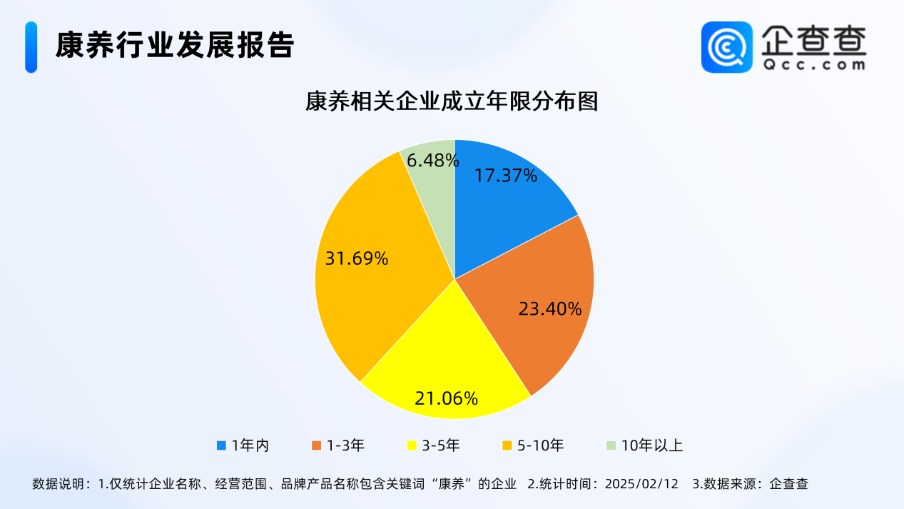 企查查数据显示,近十年相关企业注册量呈整体增长态势,2024年全年注册2.79万家,同比增长10.72%,达近十年注册量峰值,截至2月12日,今年已注册1933家相关企业。目前,国内现存康养相关企业15.01万家。从成立年限来看,成立年限在5-10年的康养相关企业占比最大,为31.69%;从行业分布来看,康养产业涉及领域广泛,其中归属于居民服务、修理和其他服务业的相关企业占比最大,达41.70%。