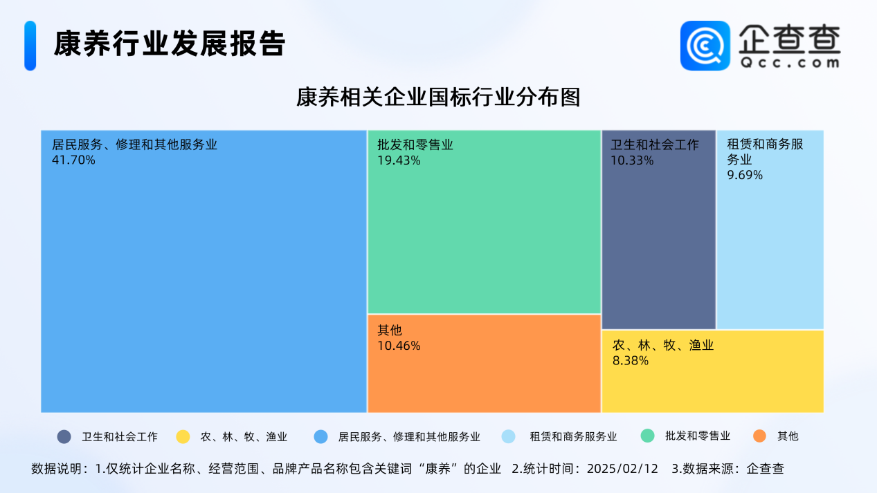 企查查数据显示,从行业分布来看,康养相关企业涉及领域广泛,其中归属于居民服务、修理和其他服务业的相关企业占比最大,达41.70%。其次,归属于批发和零售业、卫生和社会工作的康养相关企业分别占比19.43%、10.33%。此外,相关企业在租赁和商务服务业,以及农、林、牧、渔业等国标行业均有分布。