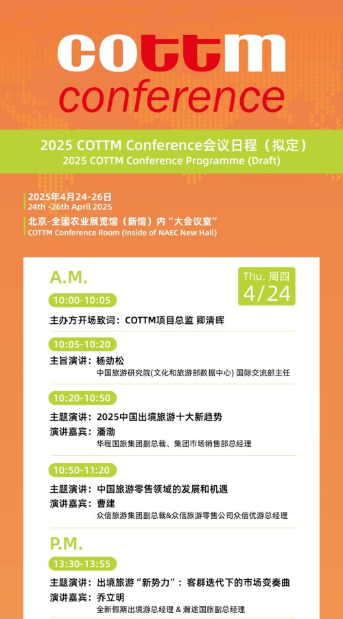 2025年4月25日,主办方在COTTM2025展会举办期间,将继续举行第二届“COTTM出境旅游投资&发展论坛(简称“COTTM投资论坛”)。